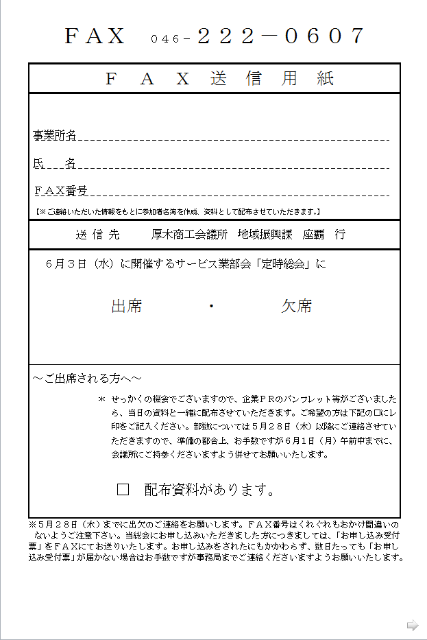 【開 催 日】 平成27年6月3日(水) 【場 所】 レンブラントホテル厚木 (神奈川県厚木市中町2-13-1) サービス業部会 ≪総 会≫ 18:00~ ≪懇親会≫ 18:30~ 【参 加 費】 一人6, 000円 ● 詳細は画像をクリックしてPDFファイルをご参考ください。 【お問い合わせ】 地域振興課 座覇(ざは) TEL:046-221-2153