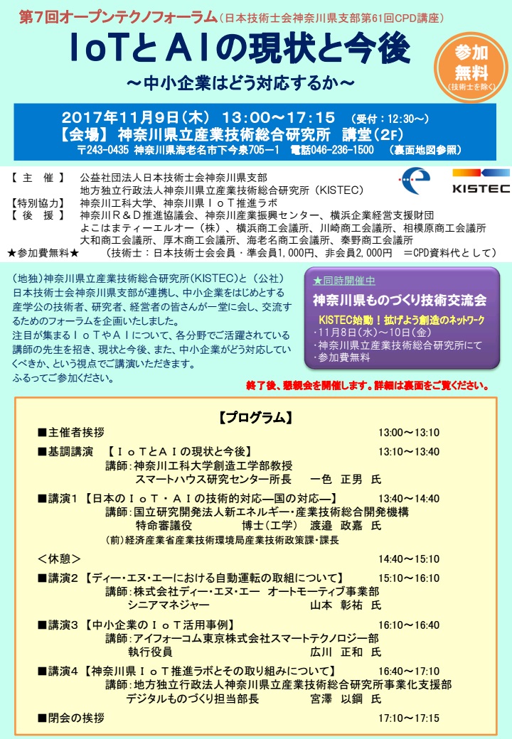 (地独)神奈川県立産業技術総合研究所(KISTEC)と (公社)日本技術士会神奈川県支部が連携し、中小企業をはじめとする産学公の技術者、研究者、経営者の皆さんが一堂に会し、交流するためのフォーラムを企画いたしました。