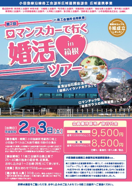 【出発日】平成30年2月3日(土) 【集合場所・時間】小田急線新宿駅西口地上 小田急トラベルはこね旅市場前8時45分集合 詳細は上の画像をクリック↑↑ 小田急と沿線にある11の商工会議所の連携事業のひとつとして婚活ツアーを開催します。 ロマンスカーに乗って冬の箱根でお相手を見つけてみませんか?ご参加お待ちしております
