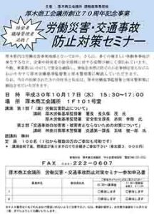 厚木管内は労働災害多発地域となっており、さらに、多くの痛ましい自動車事故が発生するなど、企業や経営者の安全管理に対する姿勢が厳しく問われています。今般、事業者はいかにして安全を確保し、事故を未然に防ぐのかを事例を交えながらわかりやすく厚木労働基準監督署と厚木警察署に解説していただきます。