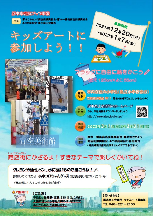 今年度も厚木市中心市街地商店会共同イベント事業の一環として、地元の小学生に絵画を制作していただき、中心市街地に「青空美術館」としての空間を創出する『キッズアート事業』を開催致します。往来する皆様に楽しんで回遊していただくことで、街を元気にすることを目的としています。