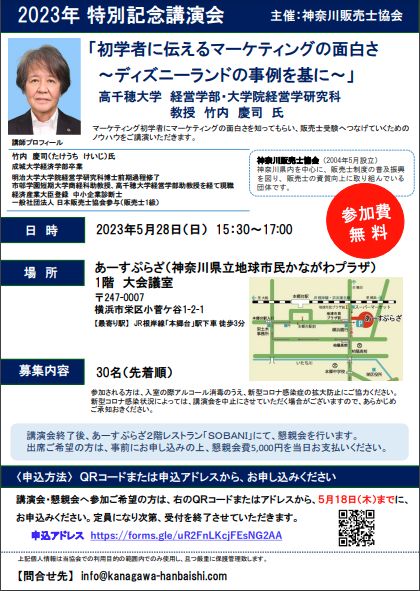 神奈川販売士協会は、2023年5月28日(日)15:30~17:00にあーすぷらざ(神奈川県立地球市民プラザ)において「特別記念講演会」 を開催します。