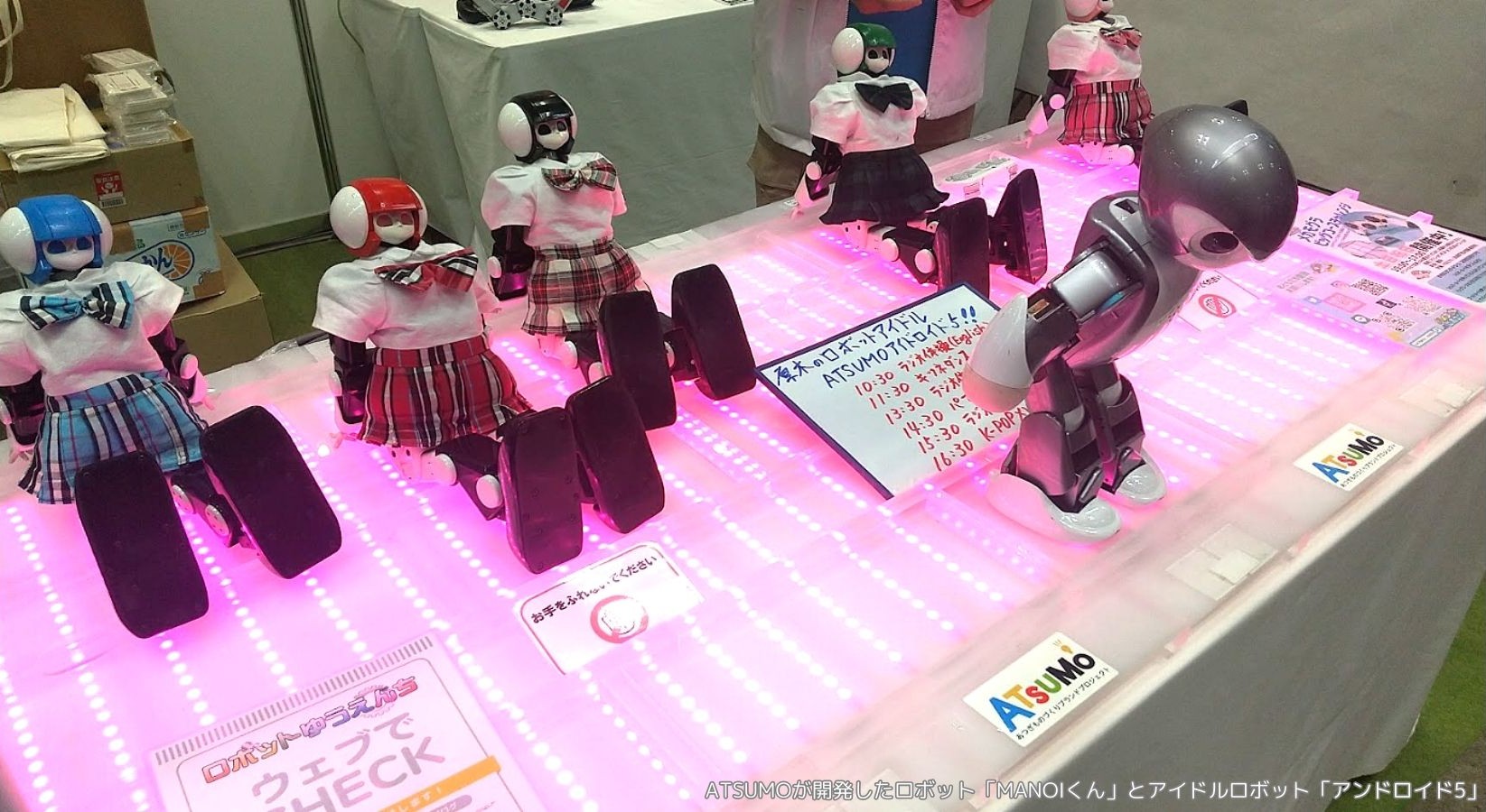 今回は厚木市内の中小製造業の技術が集まり作られたロボット「MANOIくん」とロボットアイドル「アンドロイド5」が、ダンスパフォーマンスを披露していました。ロボットたちのパフォーマンスで、厚木商工会議所合同ブースに来場者の呼び込みをしていました。
