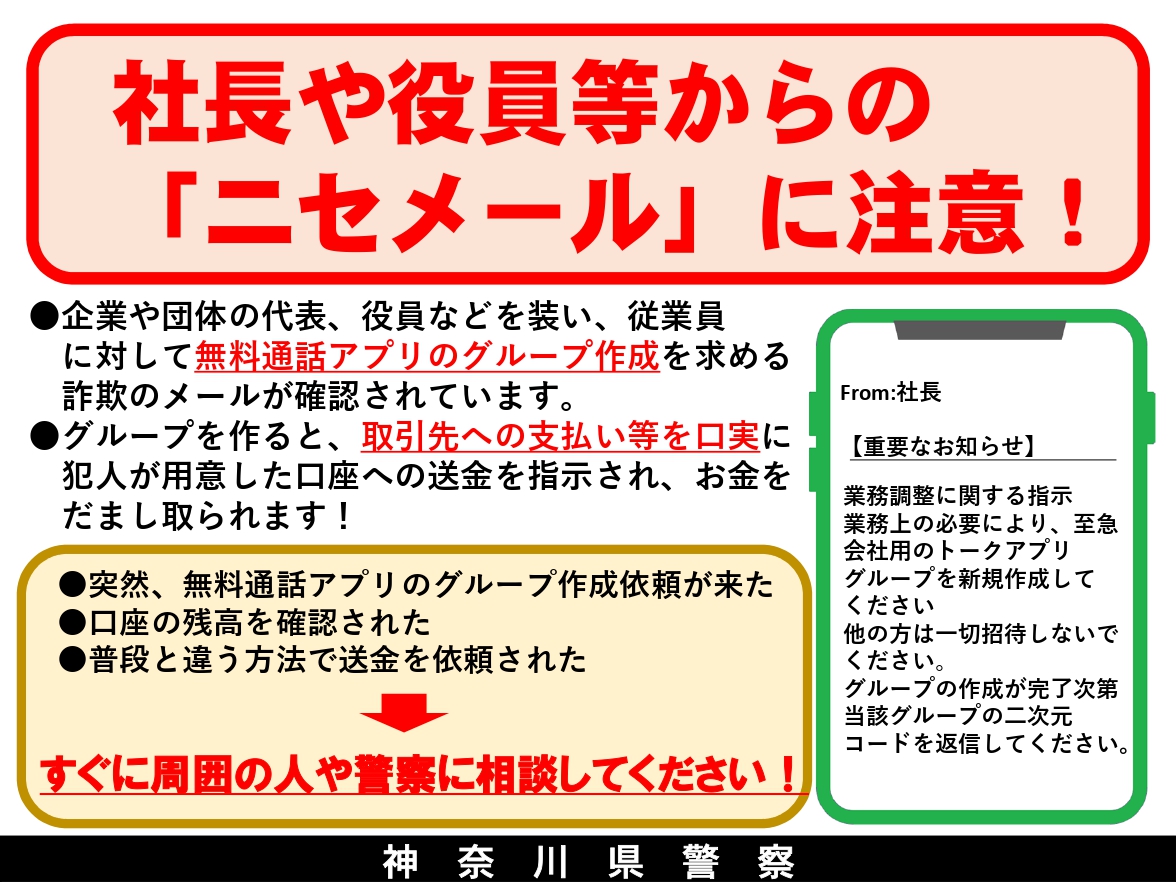 神奈川県警察本部から、企業の役員等になりすまして社員へメールを送り、金銭をだまし取る被害が多発しているとの情報がありました。